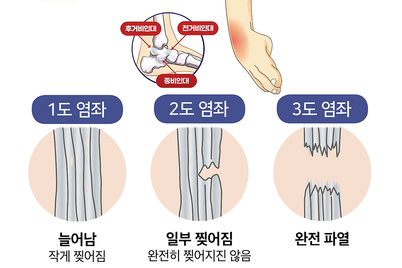 - 3도 염좌: 인대가 완전히 파열되어 연결 상태가 단절된 심각한 경우.